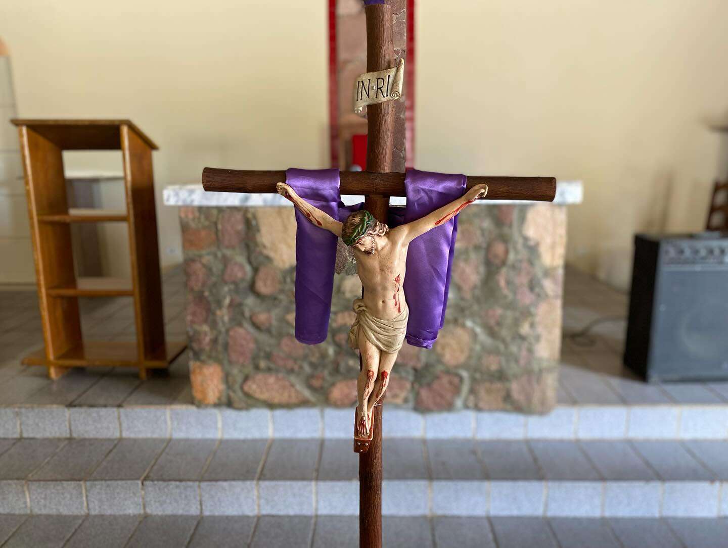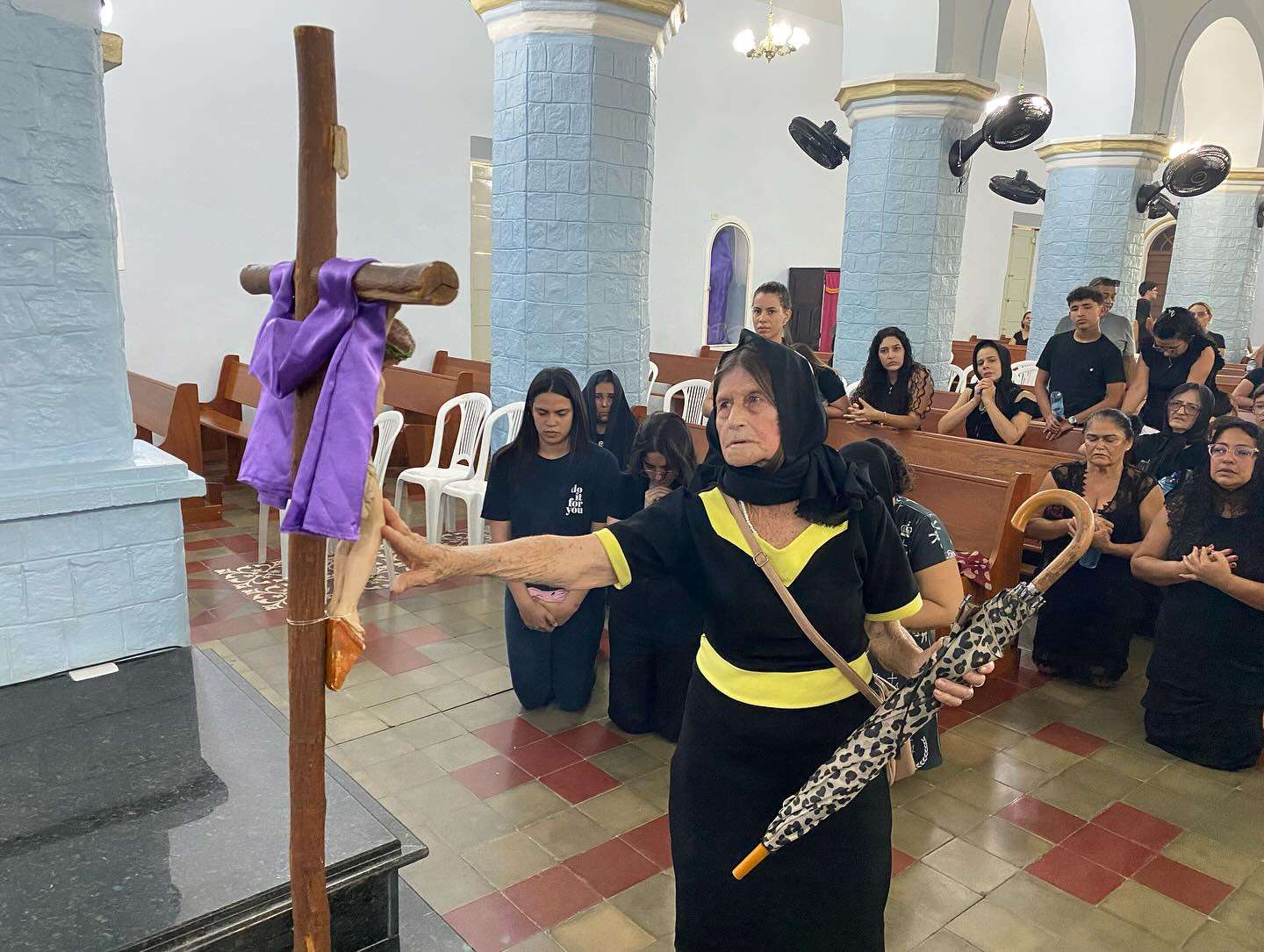 Um momento profundo de oração e silêncio, em que os fiéis meditam sobre o sofrimento e a entrega de Jesus na cruz.